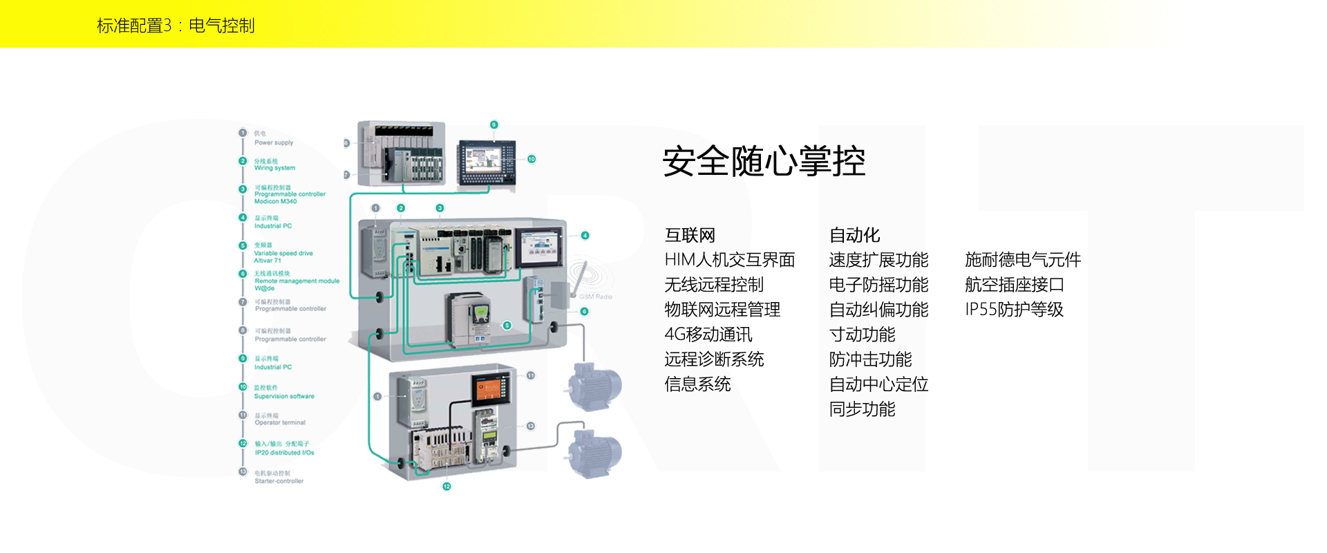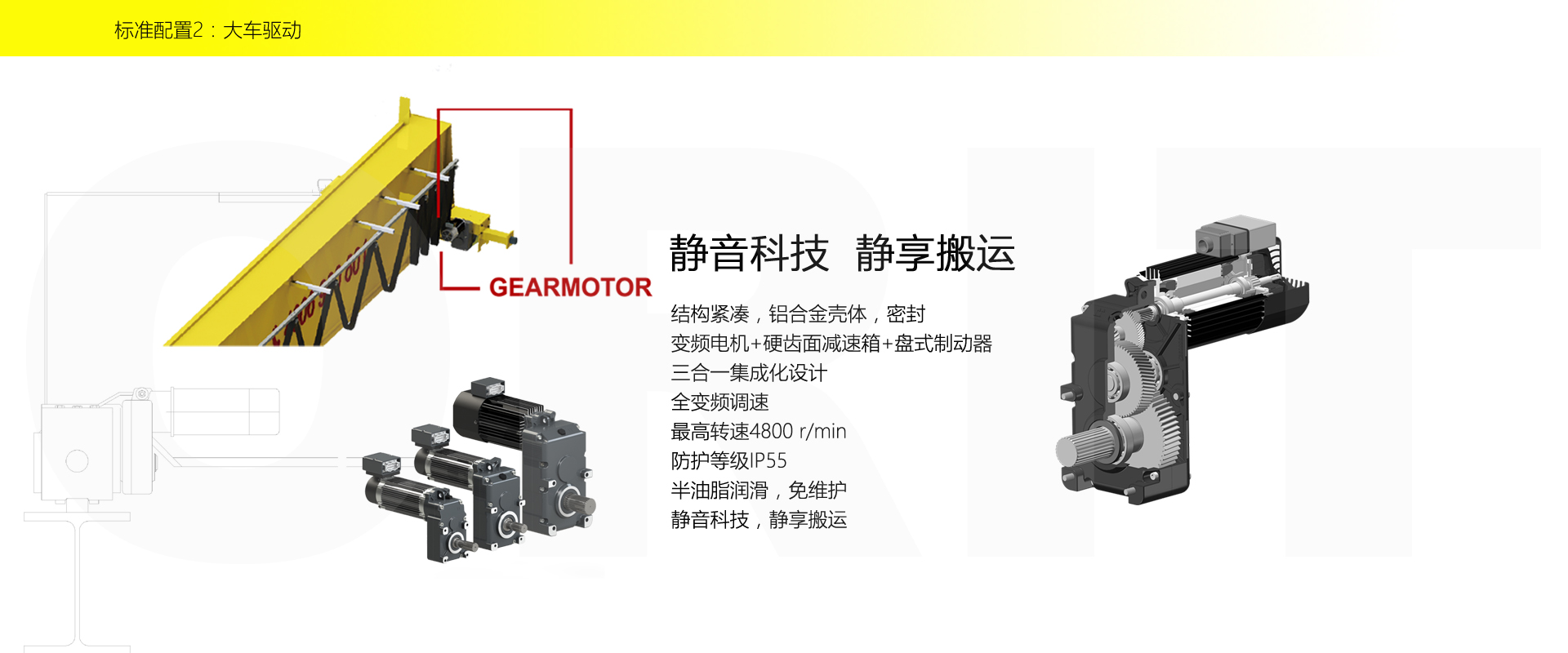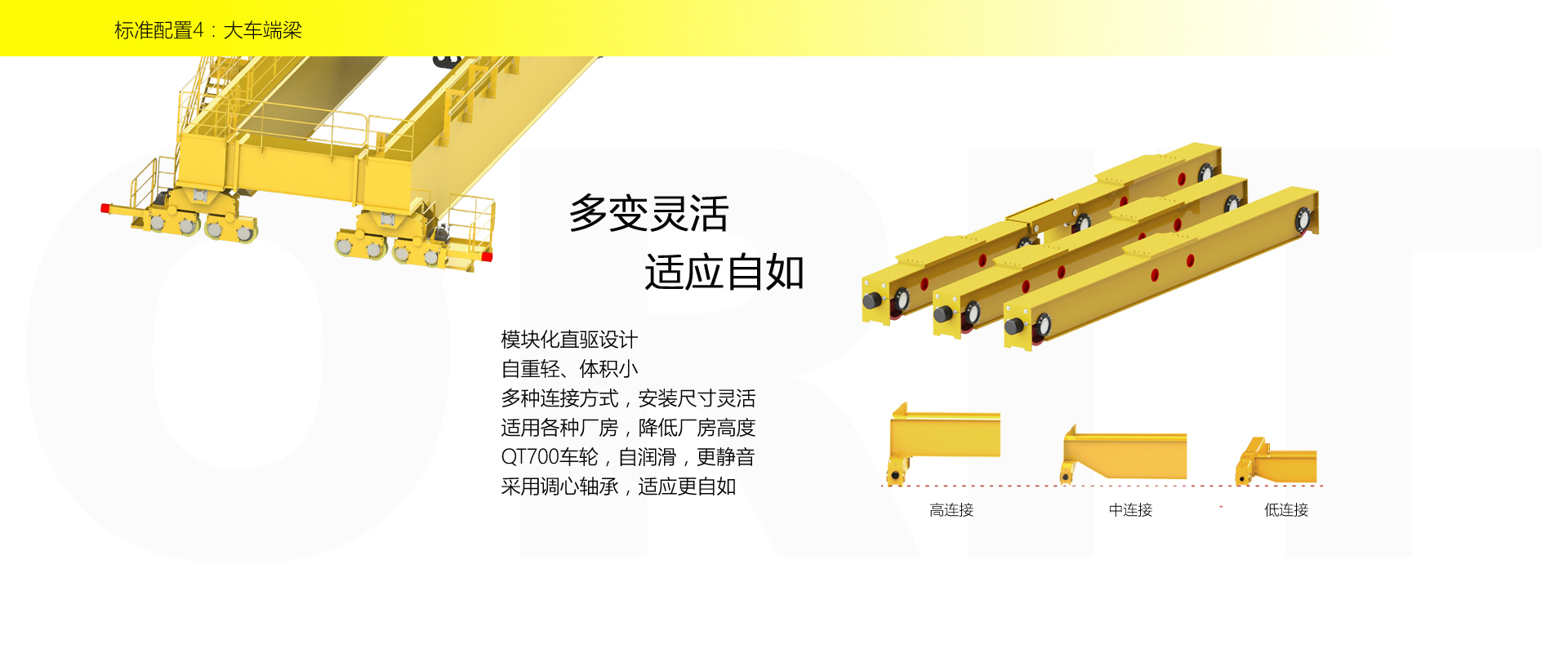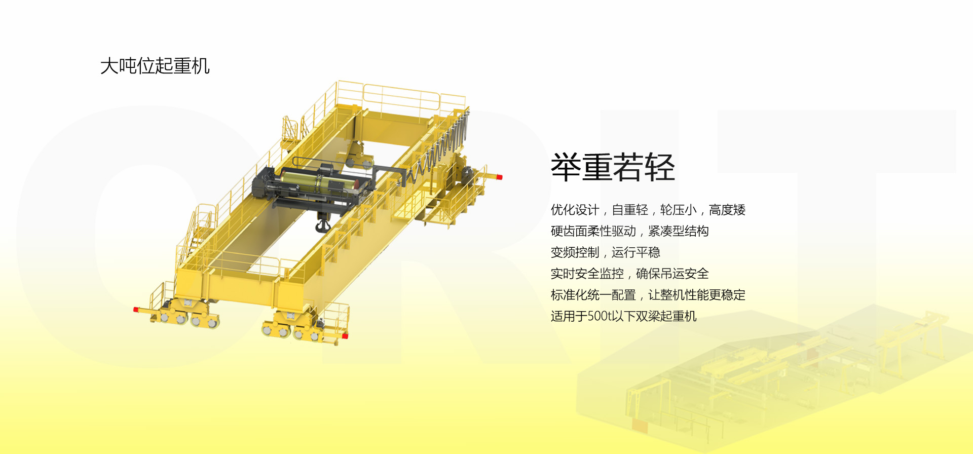 產品名稱:大噸位起重機 優化設計,自重輕,輪壓小,高度矮 硬齒面柔性驅動,緊湊型結構 變頻控制,運行平穩 實時安全監控,確保吊運安全 標準化配置,讓性能無比穩定 適用于500t以下雙梁起重機 標準配置1:起升機構 顛覆傳統,自成一體 SWL(t) HOL(m) 5-500t Max.160m 歐式智能卷揚 高度矮,自重輕,節約建筑成本 重級制,滿足持續重載作業 柔性驅動,內應力小,傳動效率高 免維護 適配各種吊具 智能化:寸動/微動/電子防搖 故障自診斷系統及HMI 標準配置2:三合一驅動 靜音科技,靜享搬運 結構緊湊,鋁合金殼體,密封 變頻電機+硬齒面減速箱+盤式制動器 龍門專用C型三合一集成化設計,節約空間 全變頻調速 最高轉速4800 r/min 防護等級IP55 半油脂潤滑,免維護 靜音科技,靜享搬運 標準配置3:電控系統 安全隨心掌控 智能安全監控器 計算起升機構剩余安全工作時間 累計起升工作時間 累計超載次數 累計起升電機啟動次數 起升電機過熱保護及報警 剎車片厚度報警 ... ... 遠程通訊 施耐德電氣元件 航空插座接口 IP55防護等級 互聯網+ HIM人機交互界面 無線遠程控制 物聯網遠程管理 4G移動通訊 遠程診斷系統 信息系統 自動化 速度擴展功能 電子防搖功能 自動糾偏功能 寸動功能 防沖擊功能 自動中心定位 同步功能 標準配置4:端梁 多變靈活,適應自如 模塊化直驅設計 自重輕、體積小 多種連接方式,安裝尺寸靈活 適用各種廠房,降低廠房高度 QT700車輪,自潤滑,更靜音 采用調心軸承,適應更自如 應用