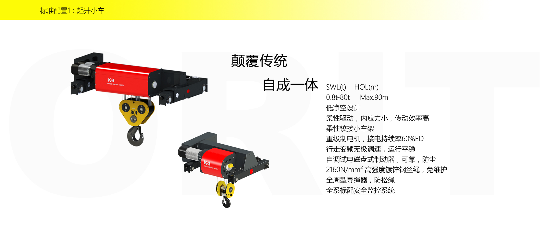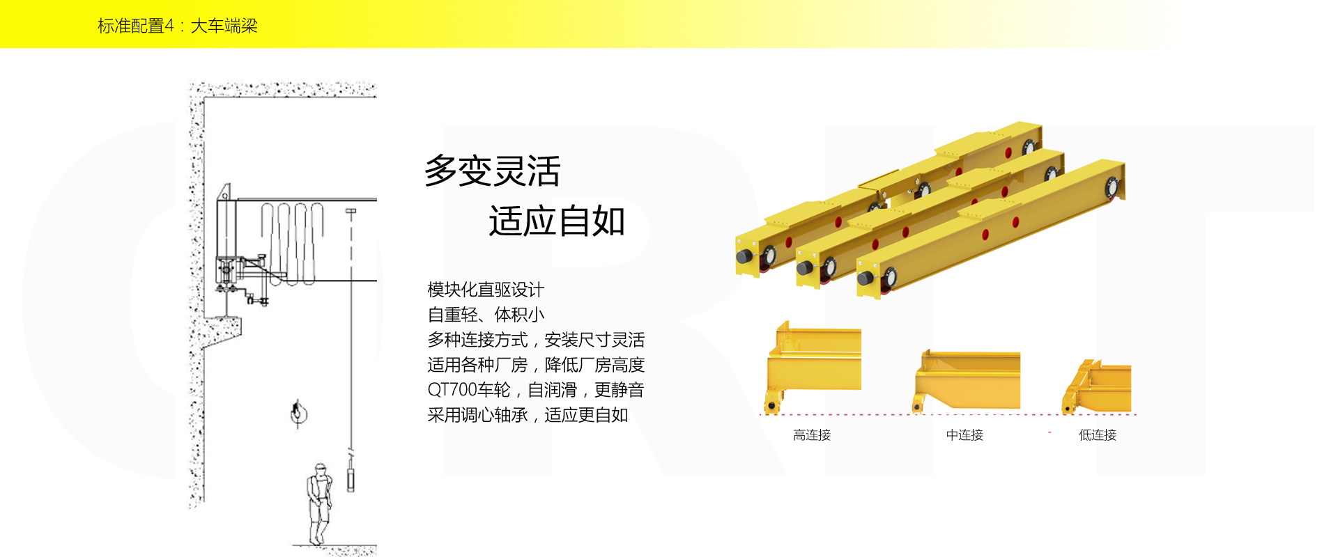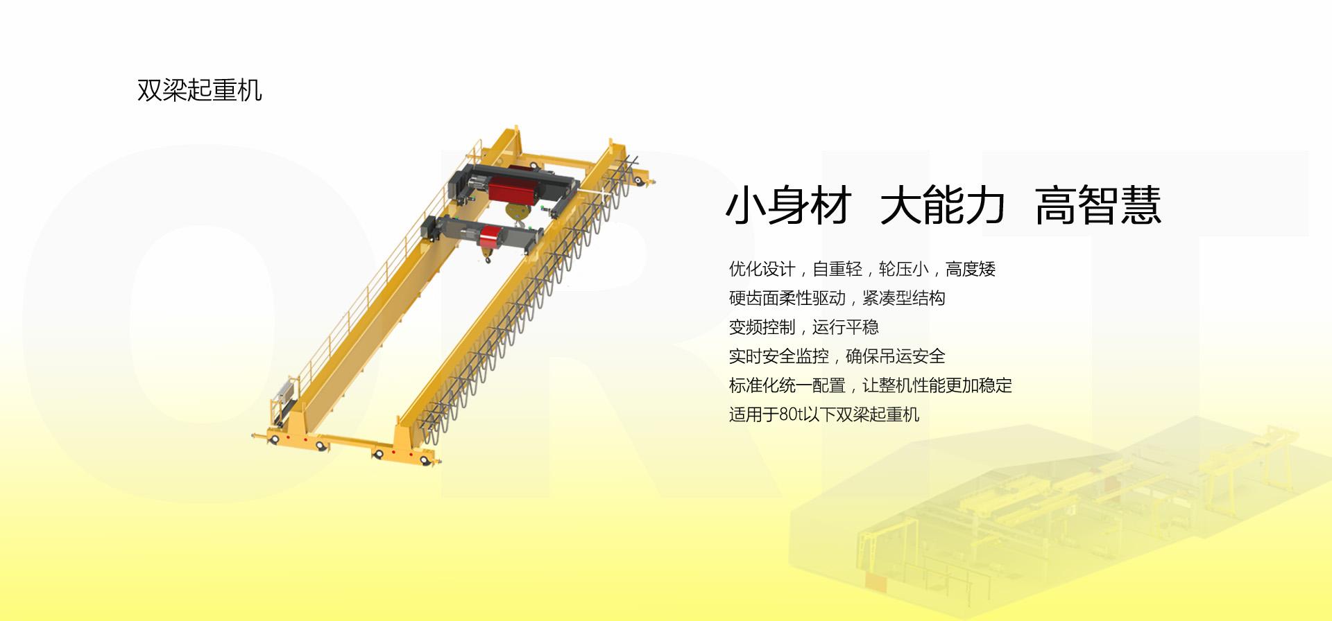 產(chǎn)品名稱(chēng):雙梁橋式起重機(jī) 小身材、大能力、高智慧 優(yōu)化設(shè)計(jì),自重輕,輪壓小,高度矮 硬齒面柔性驅(qū)動(dòng),緊湊型結(jié)構(gòu) 變頻控制,運(yùn)行平穩(wěn) 實(shí)時(shí)安全監(jiān)控,確保吊運(yùn)安全 標(biāo)準(zhǔn)化配置,讓性能無(wú)比穩(wěn)定 適用于80t以下雙梁起重機(jī) 標(biāo)準(zhǔn)配置1:起升機(jī)構(gòu) 顛覆傳統(tǒng),自成一體 SWL(t) HOL(m) 0.8t-80t Max.90m 低凈空設(shè)計(jì) 柔性驅(qū)動(dòng),內(nèi)應(yīng)力小,傳動(dòng)效率高 柔性鉸接小車(chē)架 重級(jí)制電機(jī),接電持續(xù)率60%ED 行走變頻無(wú)極調(diào)速,運(yùn)行平穩(wěn) 自調(diào)試電磁盤(pán)式制動(dòng)器,可靠,防塵 2160N/mm2 高強(qiáng)度鍍鋅鋼絲繩,免維護(hù) 全周型導(dǎo)繩器,防松繩 全系標(biāo)配安全監(jiān)控系統(tǒng) 標(biāo)準(zhǔn)配置2:三合一驅(qū)動(dòng) 靜音科技,靜享搬運(yùn) 結(jié)構(gòu)緊湊,鋁合金殼體,密封 變頻電機(jī)+硬齒面減速箱+盤(pán)式制動(dòng)器 三合一集成化設(shè)計(jì) 全變頻調(diào)速 最高轉(zhuǎn)速4800 r/min 防護(hù)等級(jí)IP55 半油脂潤(rùn)滑,免維護(hù) 靜音科技,靜享搬運(yùn) 標(biāo)準(zhǔn)配置3:電控系統(tǒng) 安全隨心掌控 智能安全監(jiān)控器 計(jì)算起升機(jī)構(gòu)剩余安全工作時(shí)間 累計(jì)起升工作時(shí)間 累計(jì)超載次數(shù) 累計(jì)起升電機(jī)啟動(dòng)次數(shù) 起升電機(jī)過(guò)熱保護(hù)及報(bào)警 剎車(chē)片厚度報(bào)警 ... ... 遠(yuǎn)程通訊 施耐德電氣元件 航空插座接口 IP55防護(hù)等級(jí) 標(biāo)準(zhǔn)配置4:端梁 多變靈活,適應(yīng)自如 模塊化直驅(qū)設(shè)計(jì) 自重輕、體積小 多種連接方式,安裝尺寸靈活 適用各種廠房,降低廠房高度 QT700車(chē)輪,自潤(rùn)滑,更靜音 采用調(diào)心軸承,適應(yīng)更自如 應(yīng)用
