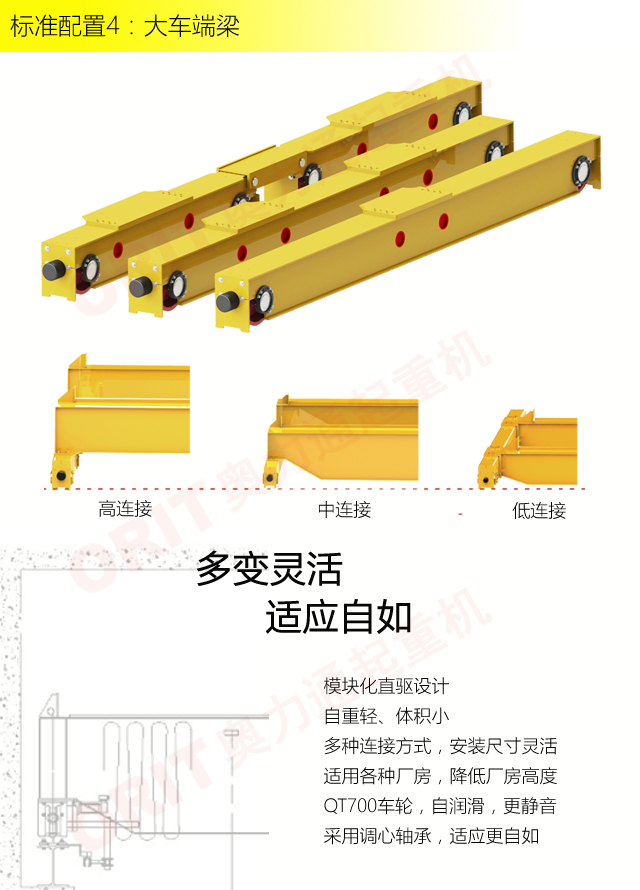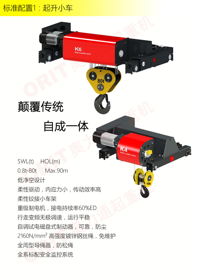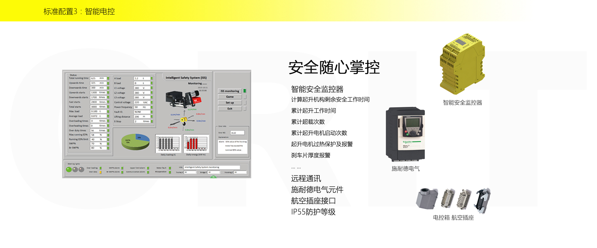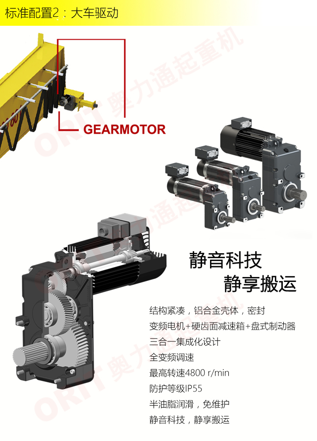 產(chǎn)品名稱(chēng):雙梁橋式起重機(jī) 小身材、大能力、高智慧 優(yōu)化設(shè)計(jì),自重輕,輪壓小,高度矮 硬齒面柔性驅(qū)動(dòng),緊湊型結(jié)構(gòu) 變頻控制,運(yùn)行平穩(wěn) 實(shí)時(shí)安全監(jiān)控,確保吊運(yùn)安全 標(biāo)準(zhǔn)化配置,讓性能無(wú)比穩(wěn)定 適用于80t以下雙梁起重機(jī) 標(biāo)準(zhǔn)配置1:起升機(jī)構(gòu) 顛覆傳統(tǒng),自成一體 SWL(t) HOL(m) 0.8t-80t Max.90m 低凈空設(shè)計(jì) 柔性驅(qū)動(dòng),內(nèi)應(yīng)力小,傳動(dòng)效率高 柔性鉸接小車(chē)架 重級(jí)制電機(jī),接電持續(xù)率60%ED 行走變頻無(wú)極調(diào)速,運(yùn)行平穩(wěn) 自調(diào)試電磁盤(pán)式制動(dòng)器,可靠,防塵 2160N/mm2 高強(qiáng)度鍍鋅鋼絲繩,免維護(hù) 全周型導(dǎo)繩器,防松繩 全系標(biāo)配安全監(jiān)控系統(tǒng) 標(biāo)準(zhǔn)配置2:三合一驅(qū)動(dòng) 靜音科技,靜享搬運(yùn) 結(jié)構(gòu)緊湊,鋁合金殼體,密封 變頻電機(jī)+硬齒面減速箱+盤(pán)式制動(dòng)器 三合一集成化設(shè)計(jì) 全變頻調(diào)速 最高轉(zhuǎn)速4800 r/min 防護(hù)等級(jí)IP55 半油脂潤(rùn)滑,免維護(hù) 靜音科技,靜享搬運(yùn) 標(biāo)準(zhǔn)配置3:電控系統(tǒng) 安全隨心掌控 智能安全監(jiān)控器 計(jì)算起升機(jī)構(gòu)剩余安全工作時(shí)間 累計(jì)起升工作時(shí)間 累計(jì)超載次數(shù) 累計(jì)起升電機(jī)啟動(dòng)次數(shù) 起升電機(jī)過(guò)熱保護(hù)及報(bào)警 剎車(chē)片厚度報(bào)警 ... ... 遠(yuǎn)程通訊 施耐德電氣元件 航空插座接口 IP55防護(hù)等級(jí) 標(biāo)準(zhǔn)配置4:端梁 多變靈活,適應(yīng)自如 模塊化直驅(qū)設(shè)計(jì) 自重輕、體積小 多種連接方式,安裝尺寸靈活 適用各種廠房,降低廠房高度 QT700車(chē)輪,自潤(rùn)滑,更靜音 采用調(diào)心軸承,適應(yīng)更自如 應(yīng)用