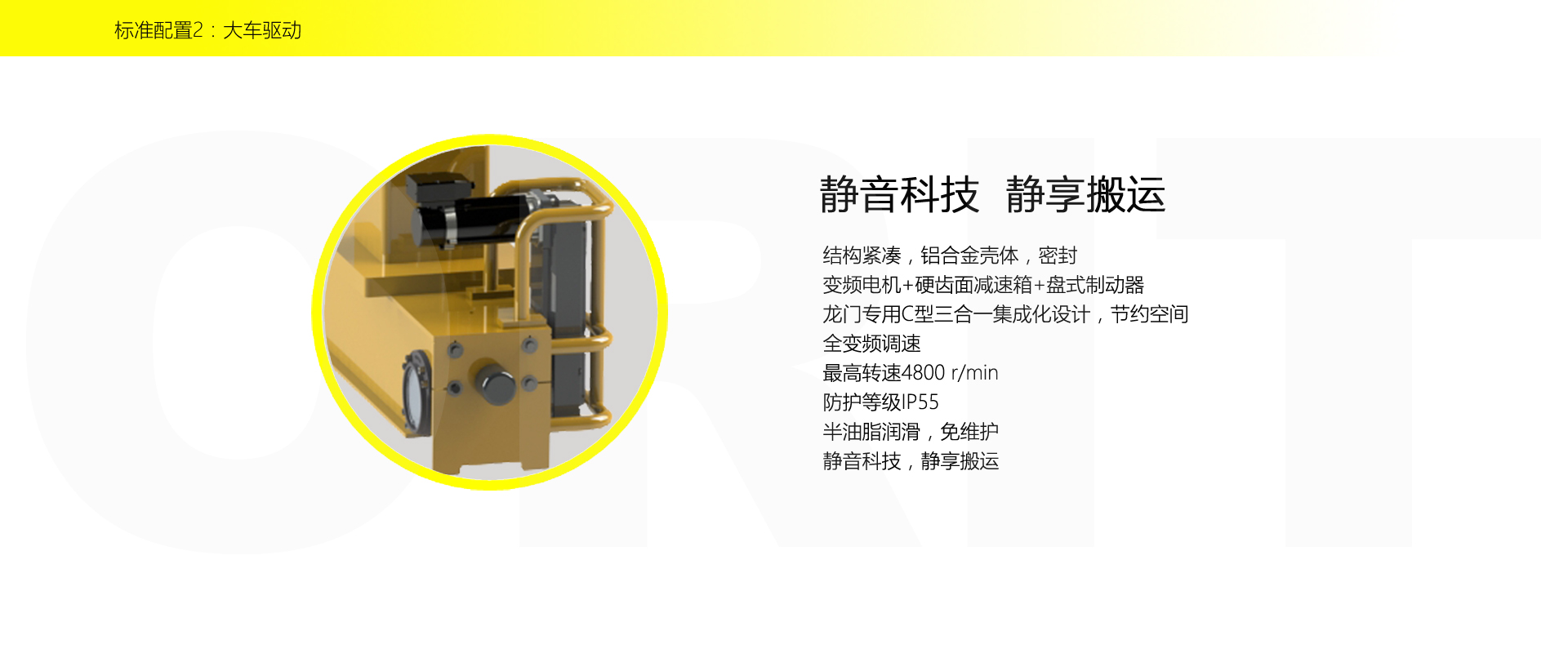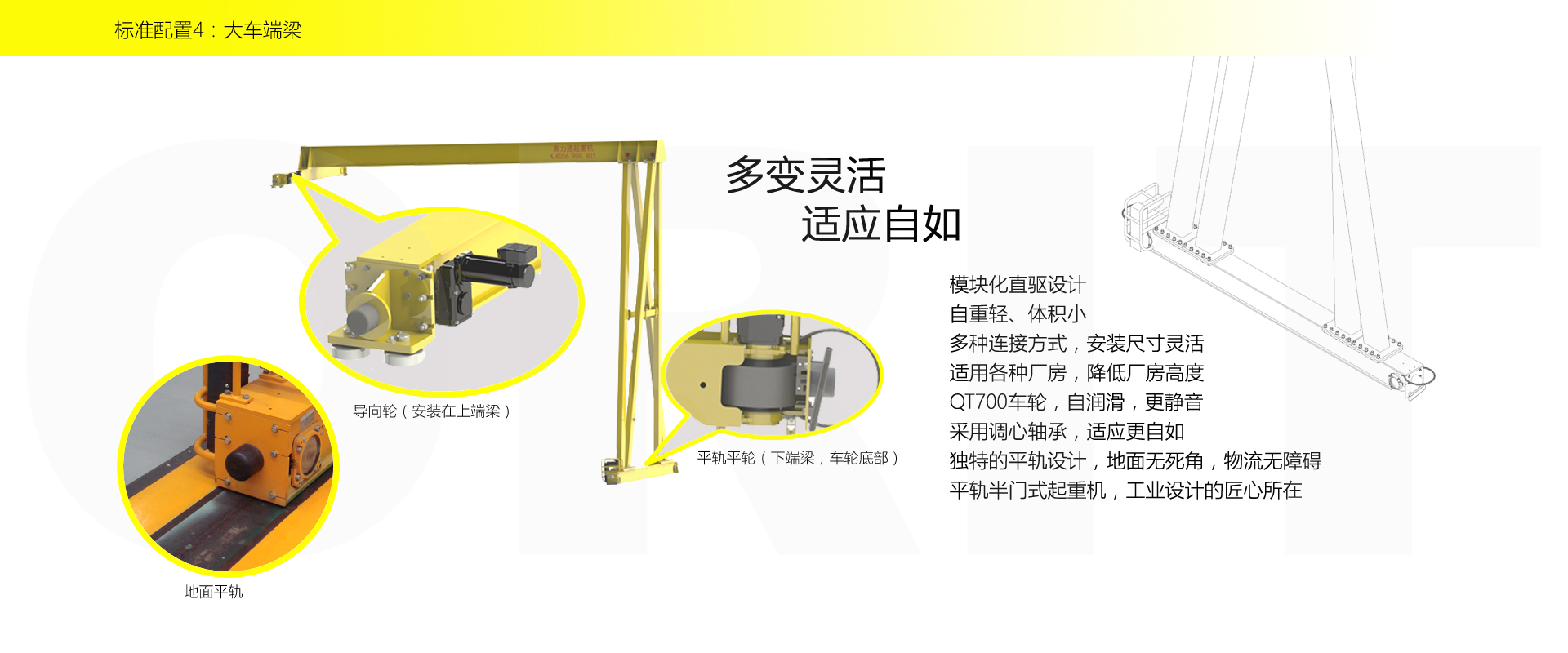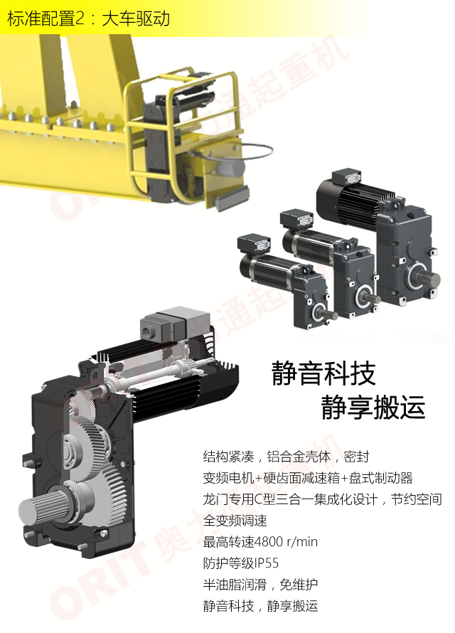 產品名稱:半門式起重機 優化設計,結構緊湊 變頻控制,運行平穩 實時安全監控,確保吊運安全 龍門吊專用C型驅動,節約空間 平軌設計,地面無障礙 美觀大方,視野開闊,便于物流 標準化配置,讓性能無比穩定 適用于12.5t以下額定載荷 標準配置1:起升機構 顛覆傳統,自成一體 低凈空設計 柔性驅動,內應力小,傳動效率高 重級制電機,接電持續率60%ED 行走變頻無極調速,運行平穩 自調試電磁盤式制動器,可靠,防塵 2160N/mm2 高強度鍍鋅鋼絲繩,免維護 全周型導繩器,防松繩 全系標配安全監控系統 標準配置2:三合一驅動 靜音科技,靜享搬運 結構緊湊,鋁合金殼體,密封 變頻電機+硬齒面減速箱+盤式制動器 龍門專用C型三合一集成化設計,節約空間 全變頻調速 最高轉速4800 r/min 防護等級IP55 半油脂潤滑,免維護 靜音科技,靜享搬運 標準配置3:電控系統 安全隨心掌控 智能安全監控器 計算起升機構剩余安全工作時間 累計起升工作時間 累計超載次數 累計起升電機啟動次數 起升電機過熱保護及報警 剎車片厚度報警 ... ... 遠程通訊 施耐德電氣元件 航空插座接口 IP55防護等級 標準配置4:端梁 多變靈活,適應自如 模塊化直驅設計 自重輕、體積小 多種連接方式,安裝尺寸靈活 適用各種廠房,降低廠房高度 QT700車輪,自潤滑,更靜音 采用調心軸承,適應更自如 獨特的平軌設計,地面無死角,物流無障礙 平軌半門式起重機,工業設計的匠心所在