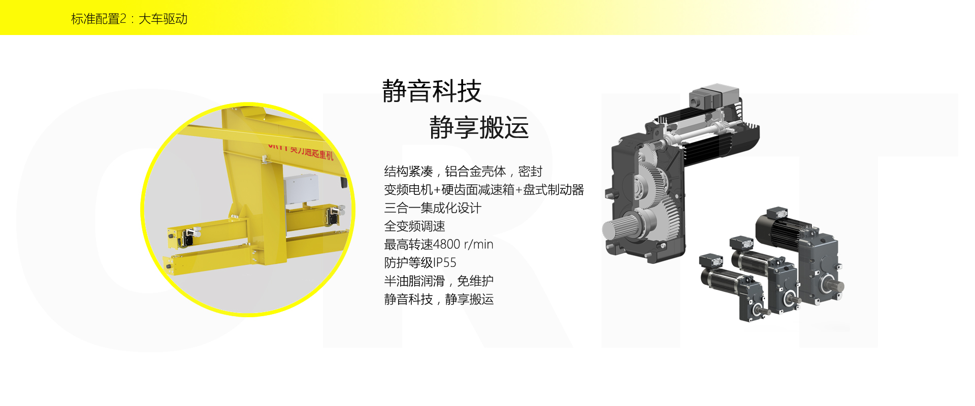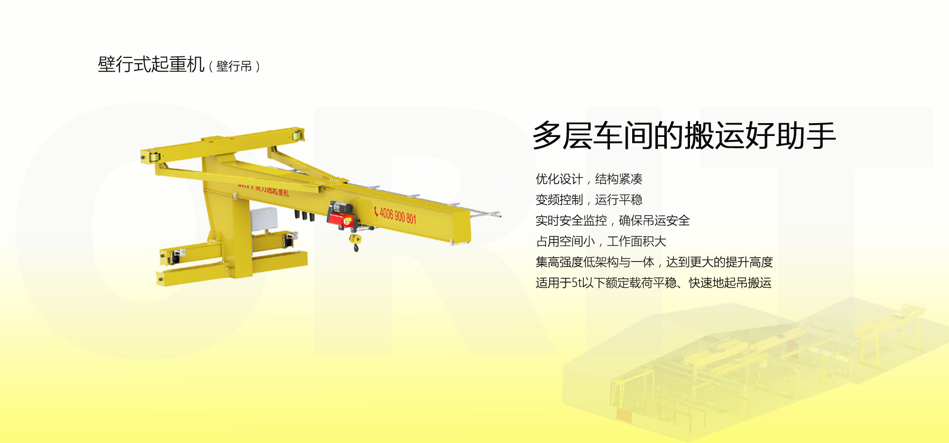 產品名稱:壁行式起重機 多層車間的最佳選擇 優(yōu)化設計,結構緊湊 變頻控制,運行平穩(wěn) 實時安全監(jiān)控,確保吊運安全 占用空間小,工作面積大 集高強度低架構與一體,達到最大的提升設計 適用于5t以下額定載荷平穩(wěn)、快速地起吊搬運。 標準配置1:起升機構 顛覆傳統(tǒng),自成一體 低凈空設計 柔性驅動,內應力小,傳動效率高 重級制電機,接電持續(xù)率60%ED 行走變頻無極調速,運行平穩(wěn) 自調試電磁盤式制動器,可靠,防塵 2160N/mm2 高強度鍍鋅鋼絲繩,免維護 全周型導繩器,防松繩 全系標配安全監(jiān)控系統(tǒng) 標準配置2:三合一驅動 靜音科技,靜享搬運 結構緊湊,鋁合金殼體,密封 變頻電機+硬齒面減速箱+盤式制動器 龍門專用C型三合一集成化設計,節(jié)約空間 全變頻調速 最高轉速4800 r/min 防護等級IP55 半油脂潤滑,免維護 靜音科技,靜享搬運 標準配置3:電控系統(tǒng) 安全隨心掌控 智能安全監(jiān)控器 計算起升機構剩余安全工作時間 累計起升工作時間 累計超載次數 累計起升電機啟動次數 起升電機過熱保護及報警 剎車片厚度報警 ... ... 遠程通訊 施耐德電氣元件 航空插座接口 IP55防護等級 標準配置4:端梁 多變靈活,適應自如 模塊化直驅設計 自重輕、體積小 QT700車輪,自潤滑,更靜音 采用調心軸承,適應更自如 雙輪緣端梁與平輪端梁完美結合, 既滿足受力要求, 又徹底的解決了三條端梁(軌道)可能產生的啃軌問題。 應用