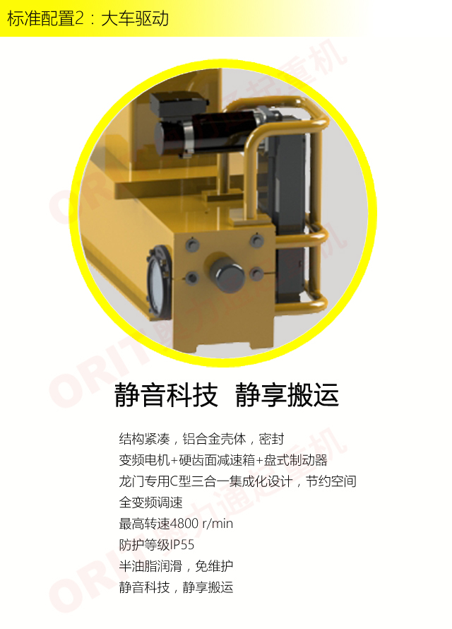 產品名稱:單梁門式起重機 小巧玲瓏,節省空間 優化設計,結構緊湊 柔性支腿,有效釋放應力,延長結構壽命 柔性支腿,讓龍門小巧玲瓏,節省空間 變頻控制,運行平穩 實時安全監控,確保吊運安全 標準化配置,讓性能無比穩定 無牛腿車間搬運的最佳解決方案 適用于20t以下額定載荷起吊 標準配置1:起升機構 顛覆傳統,自成一體 低凈空設計 柔性驅動,內應力小,傳動效率高 重級制電機,接電持續率60%ED 行走變頻無極調速,運行平穩 自調試電磁盤式制動器,可靠,防塵 2160N/mm2 高強度鍍鋅鋼絲繩,免維護 全周型導繩器,防松繩 全系標配安全監控系統 標準配置2:三合一驅動 靜音科技,靜享搬運 結構緊湊,鋁合金殼體,密封 變頻電機+硬齒面減速箱+盤式制動器 龍門專用C型三合一集成化設計,節約空間 全變頻調速 最高轉速4800 r/min 防護等級IP55 半油脂潤滑,免維護 靜音科技,靜享搬運 標準配置3:電控系統 安全隨心掌控 智能安全監控器 計算起升機構剩余安全工作時間 累計起升工作時間 累計超載次數 累計起升電機啟動次數 起升電機過熱保護及報警 剎車片厚度報警 ... ... 遠程通訊 施耐德電氣元件 航空插座接口 IP55防護等級 標準配置4:端梁 多變靈活,適應自如 模塊化直驅設計 自重輕、體積小 多種連接方式,安裝尺寸靈活 適用各種廠房,降低廠房高度 QT700車輪,自潤滑,更靜音 采用調心軸承,適應更自如 應用